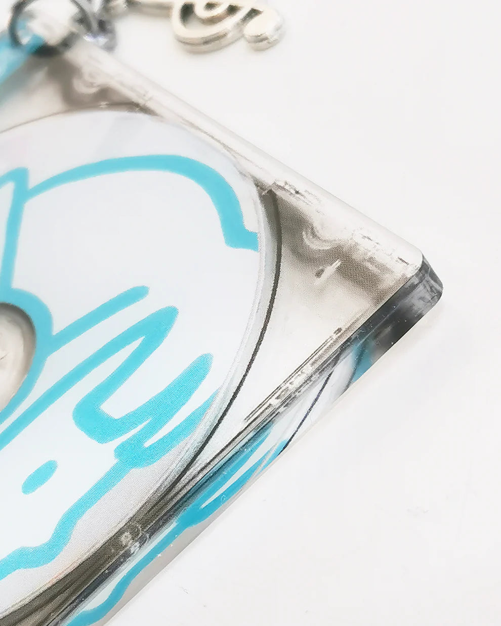 Please note the CD charm is not openable! It is a flat, printed acrylic charm. The jewel case effect is printed with a dark grey ink that gives the charm a bit of a grungy look when laid on a light, opaque surface (as you can see in the product photos!). The effect looks more convincing in photos, so I wanted to disclaim!!! I was initially going to create an openable / spinning keychain, but decided against it for durability and longevity <3